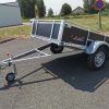 Además, la remolque está equipada con un mecanismo de basculamiento por inercia, un timón en forma de V para una mejor maniobrabilidad, una rueda jockey delantera para facilitar el estacionamiento y un sistema eléctrico de 12V.